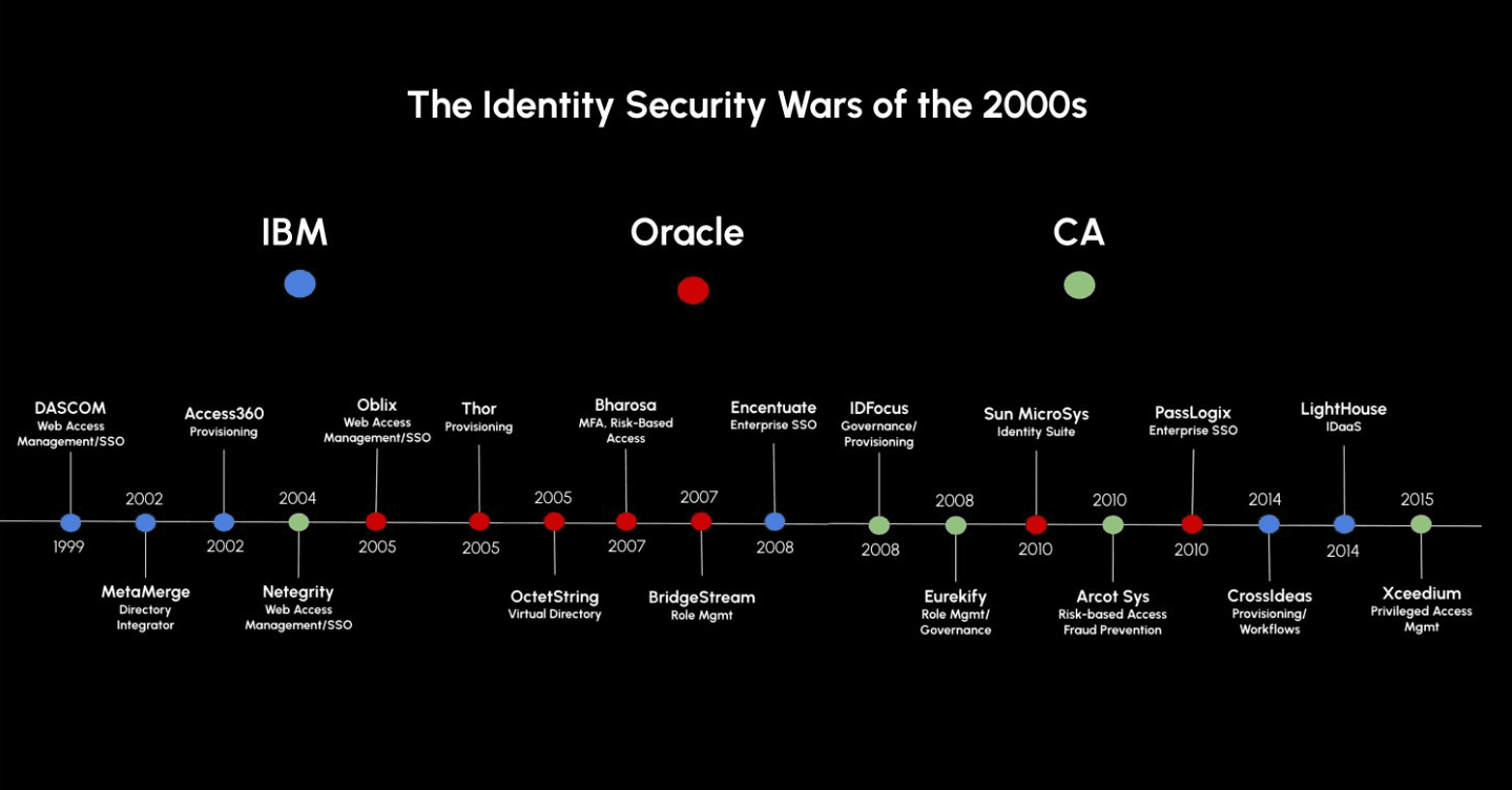 In many ways, IBM created the IAM market and ignited the arms race for consolidation across the Identity ecosystem. It started with IBM acquiring DASCOM’s Web Access Management solution in 1999 (founded by the truly accomplished, once in a generation Greg Clark), followed by acquisitions of MetaMerge (LDAP Directory Integrator) and Access360 for Provisioning in 2002 - all this while I was still a sophomore studying computer science at Nanyang Technological University Singapore.